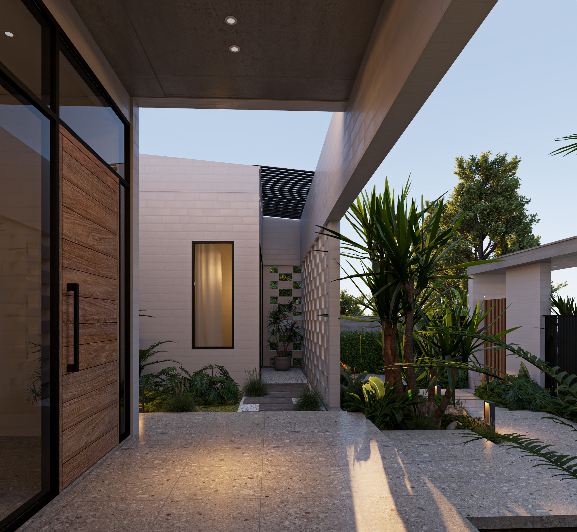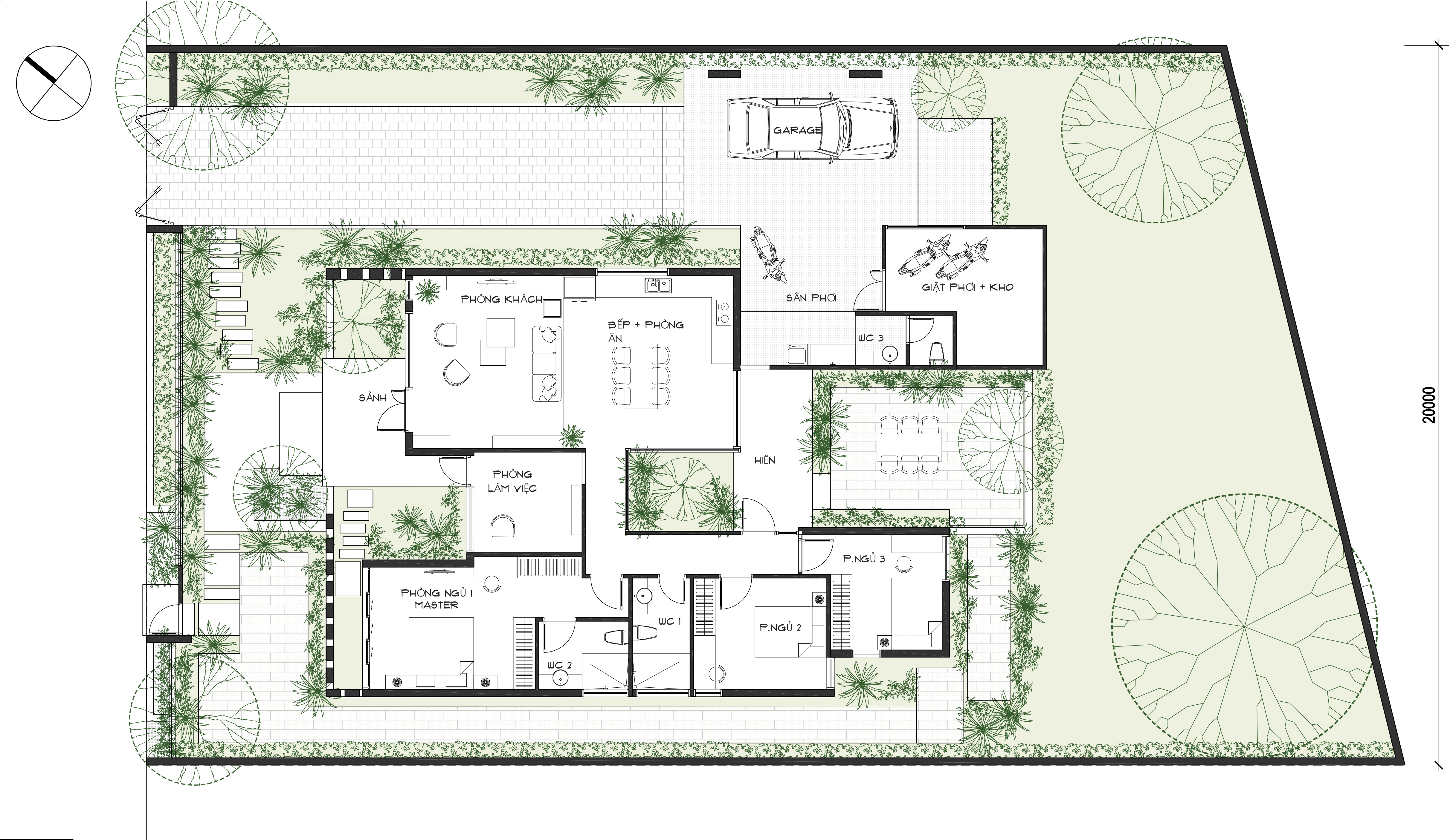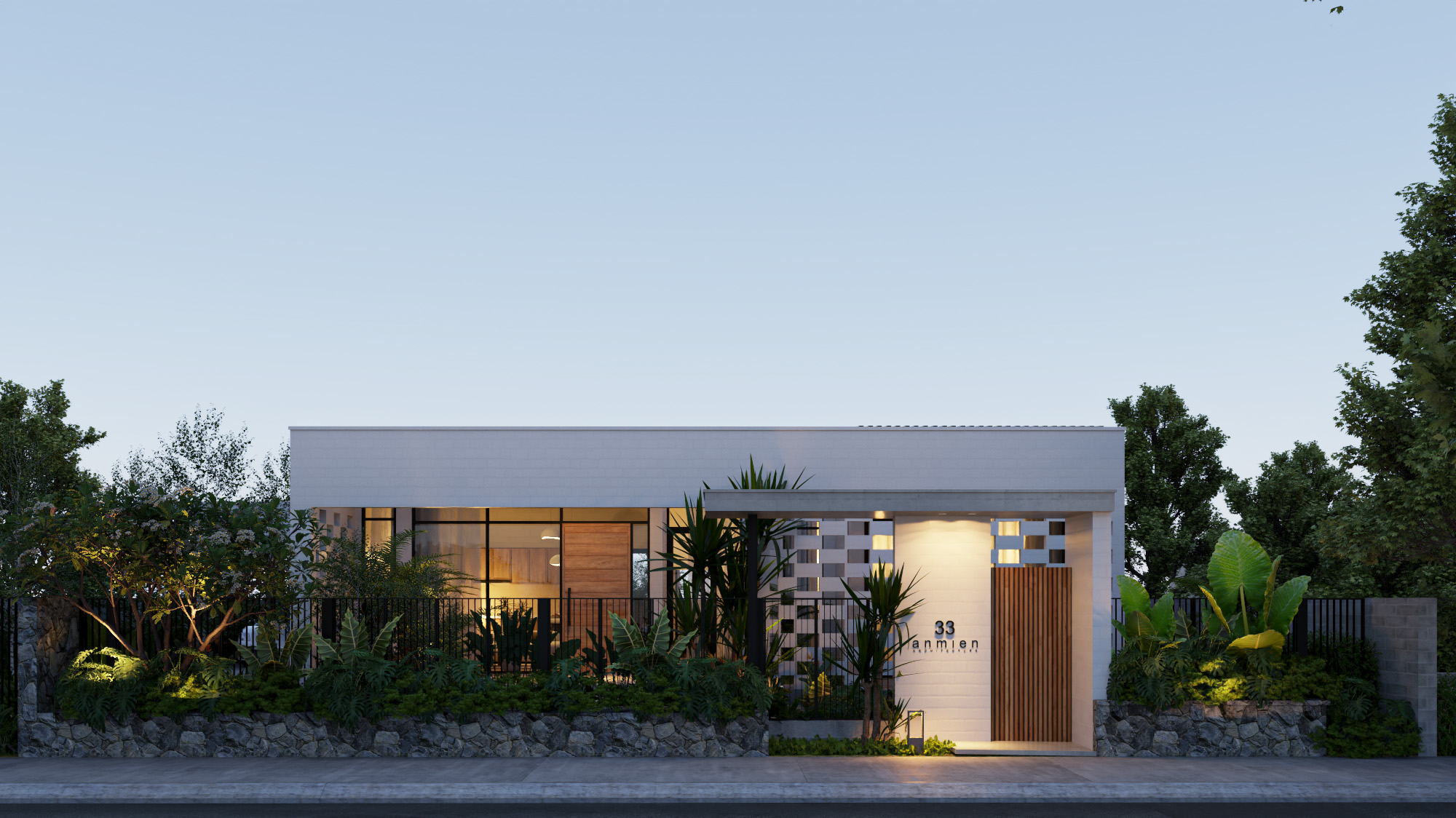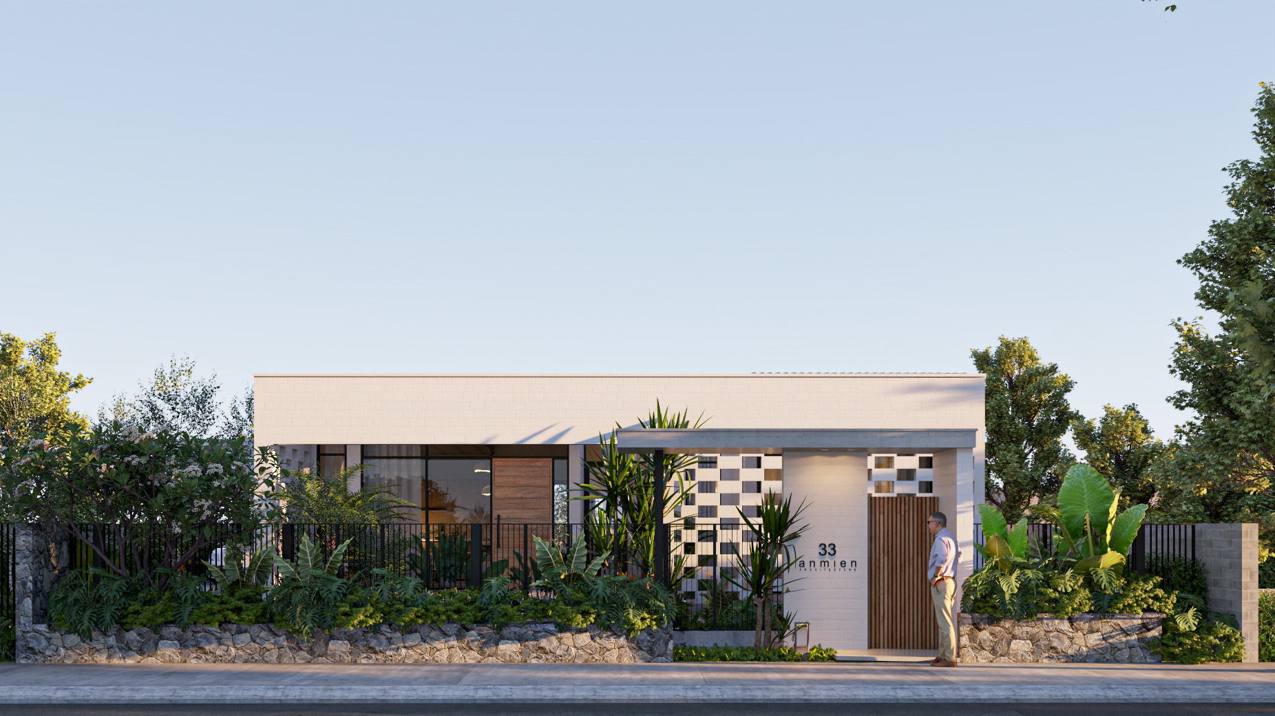 Công trình được thiết kế trên nền đất vườn 700m2 với lối kiến trúc nhiệt đới hiện đại, vì sự gần gũi với thiên nhiên nên có sự đan xen các mảng xanh, tiểu cảnh giữa các khu vực chức năng. Do mặt tiền hướng tây nam đón nắng chiều nên việc xây dựng hệ tường xây đan xen để hạn chế bức xạ ánh sáng, tạo điểm nhấn mặt tiền, đảm bảo tính riêng tư nhưng cũng gần gũi với không gian bên ngoài.
