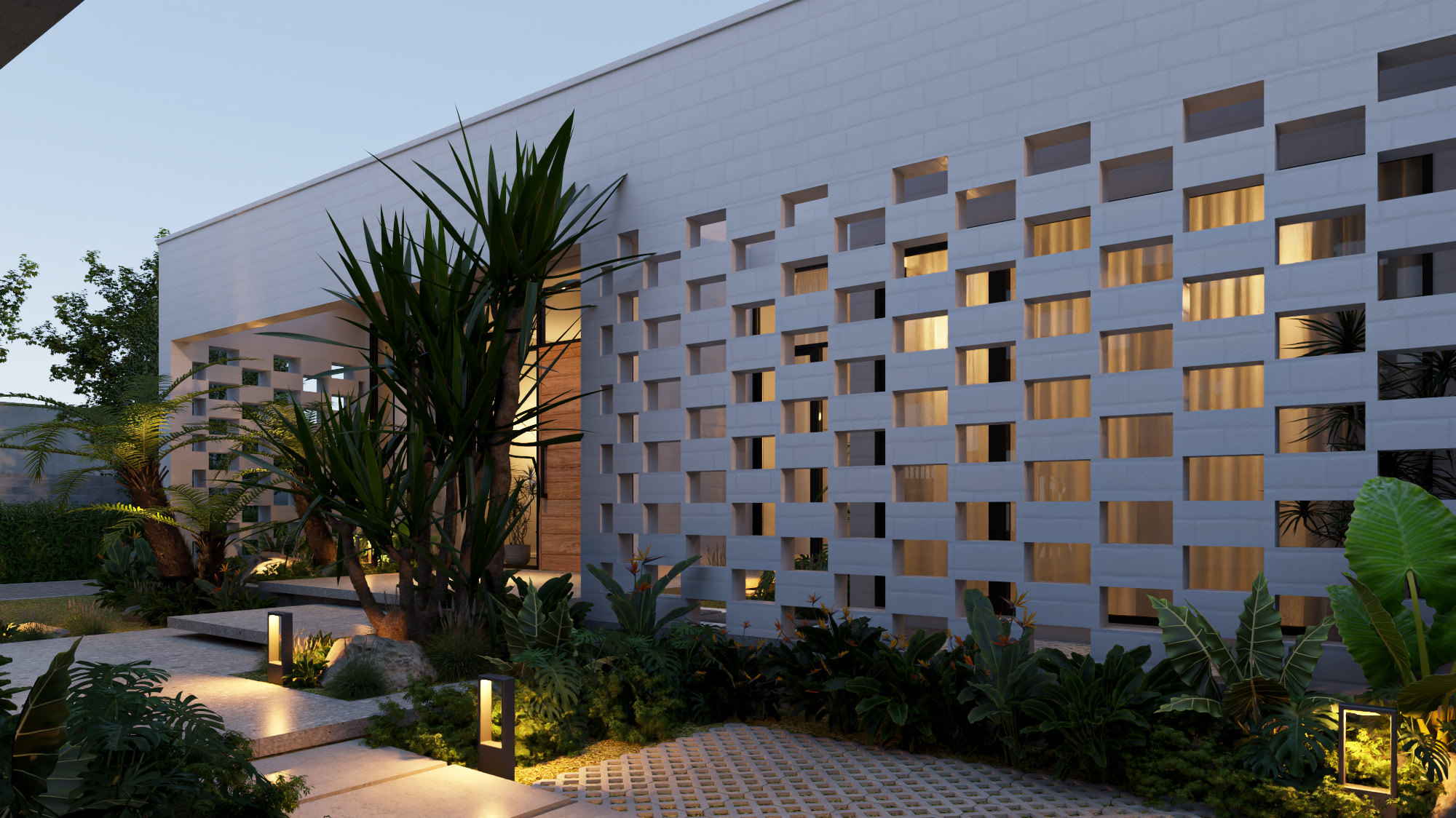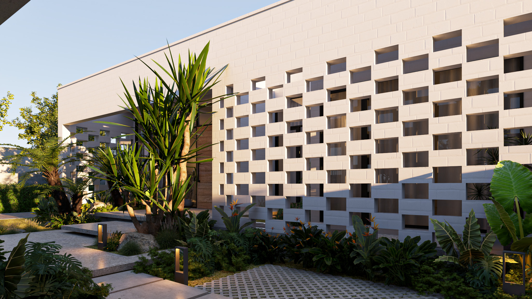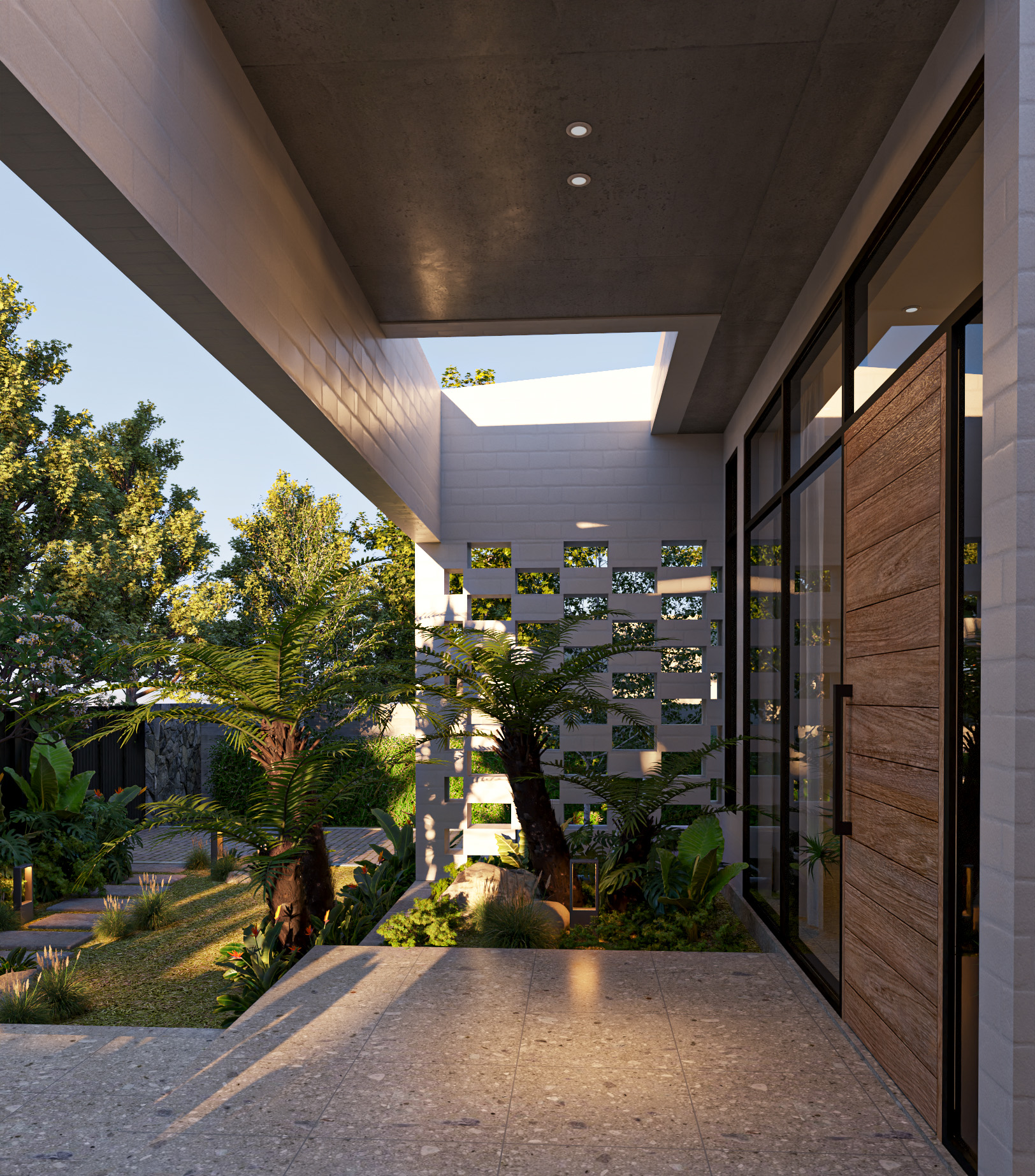 Công trình được thiết kế trên nền đất vườn 700m2 với lối kiến trúc nhiệt đới hiện đại, vì sự gần gũi với thiên nhiên nên có sự đan xen các mảng xanh, tiểu cảnh giữa các khu vực chức năng. Do mặt tiền hướng tây nam đón nắng chiều nên việc xây dựng hệ tường xây đan xen để hạn chế bức xạ ánh sáng, tạo điểm nhấn mặt tiền, đảm bảo tính riêng tư nhưng cũng gần gũi với không gian bên ngoài.