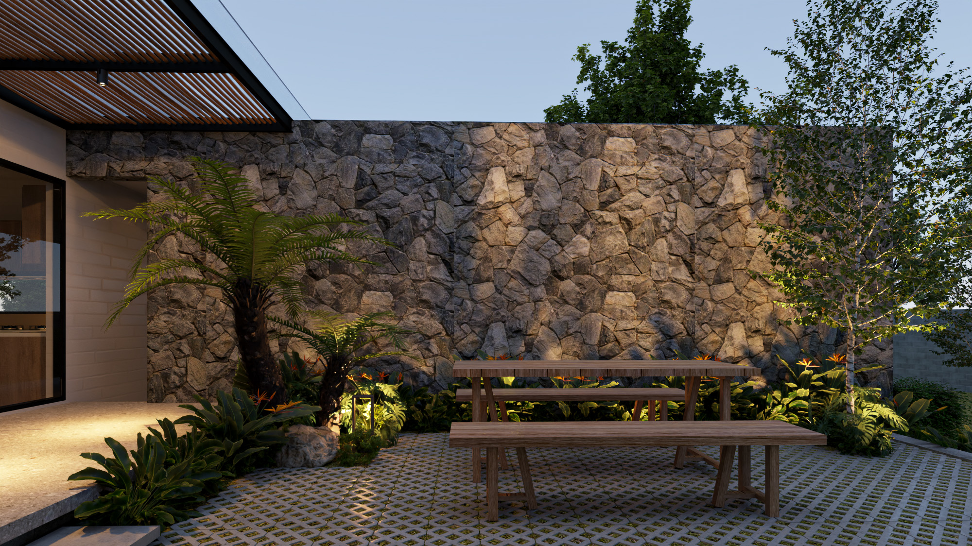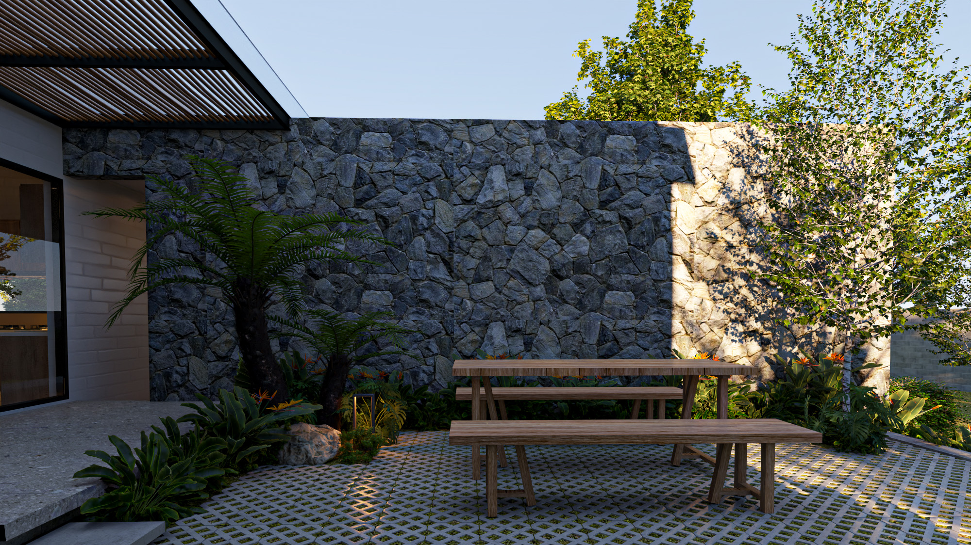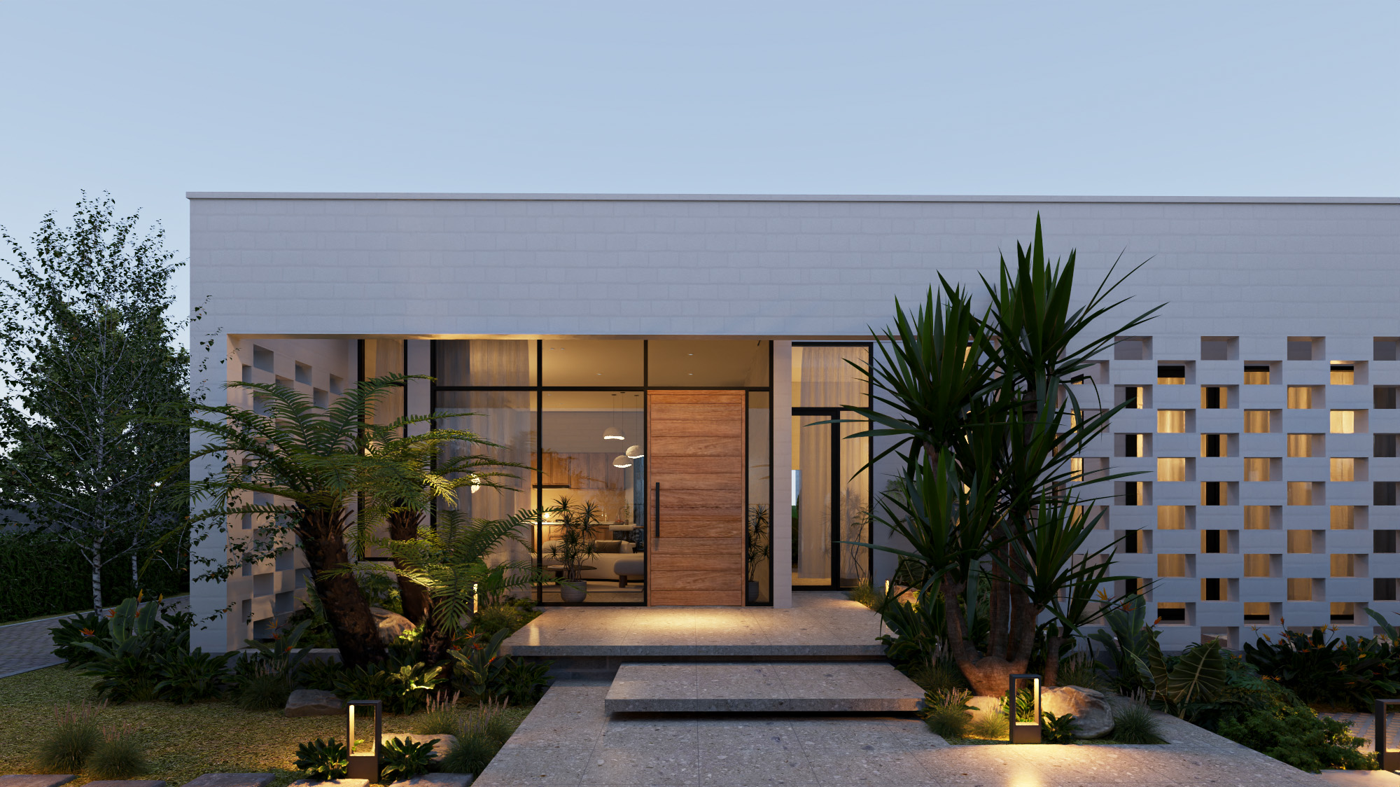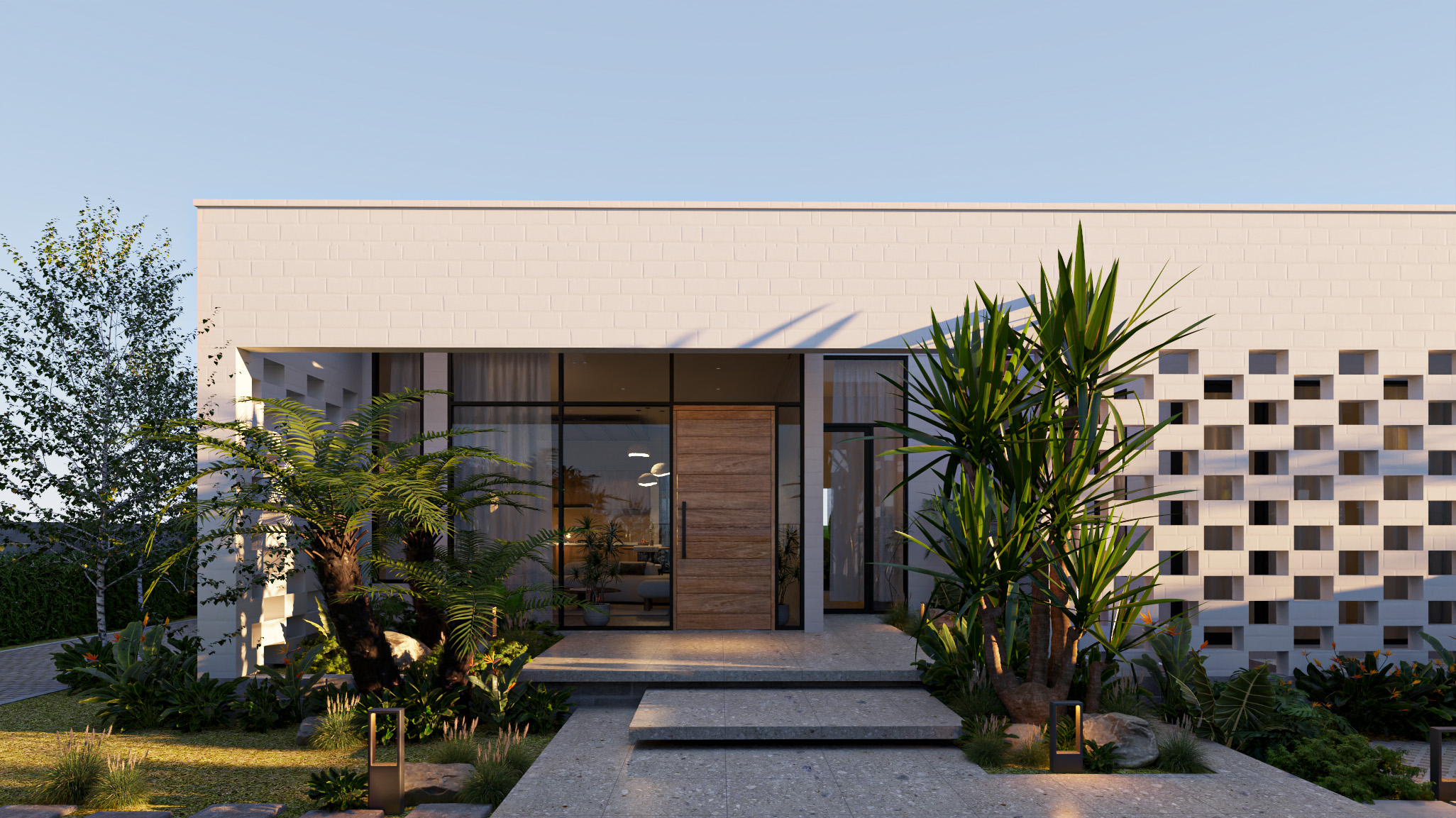Công trình được thiết kế trên nền đất vườn 700m2 với lối kiến trúc nhiệt đới hiện đại, vì sự gần gũi với thiên nhiên nên có sự đan xen các mảng xanh, tiểu cảnh giữa các khu vực chức năng. Do mặt tiền hướng tây nam đón nắng chiều nên việc xây dựng hệ tường xây đan xen để hạn chế bức xạ ánh sáng, tạo điểm nhấn mặt tiền, đảm bảo tính riêng tư nhưng cũng gần gũi với không gian bên ngoài.